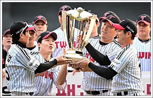 엘지 (LG)그룹이 29년 만에 한국시리즈 첫 우승을 컵을 손에 들었습니다
