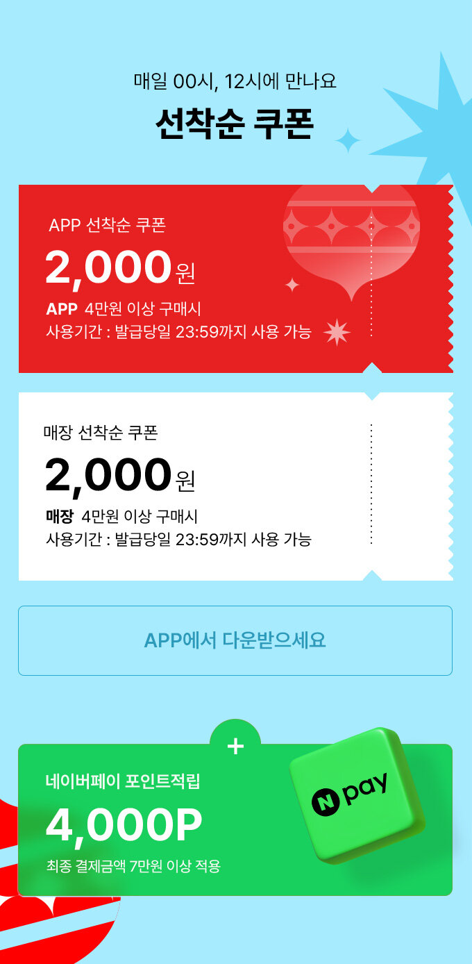 선착순 쿠폰은 매일 00시, 12시에 발급되며 5,000원의 첫 구매 선착순 쿠폰도 함께 발급 받드시면 됩니다