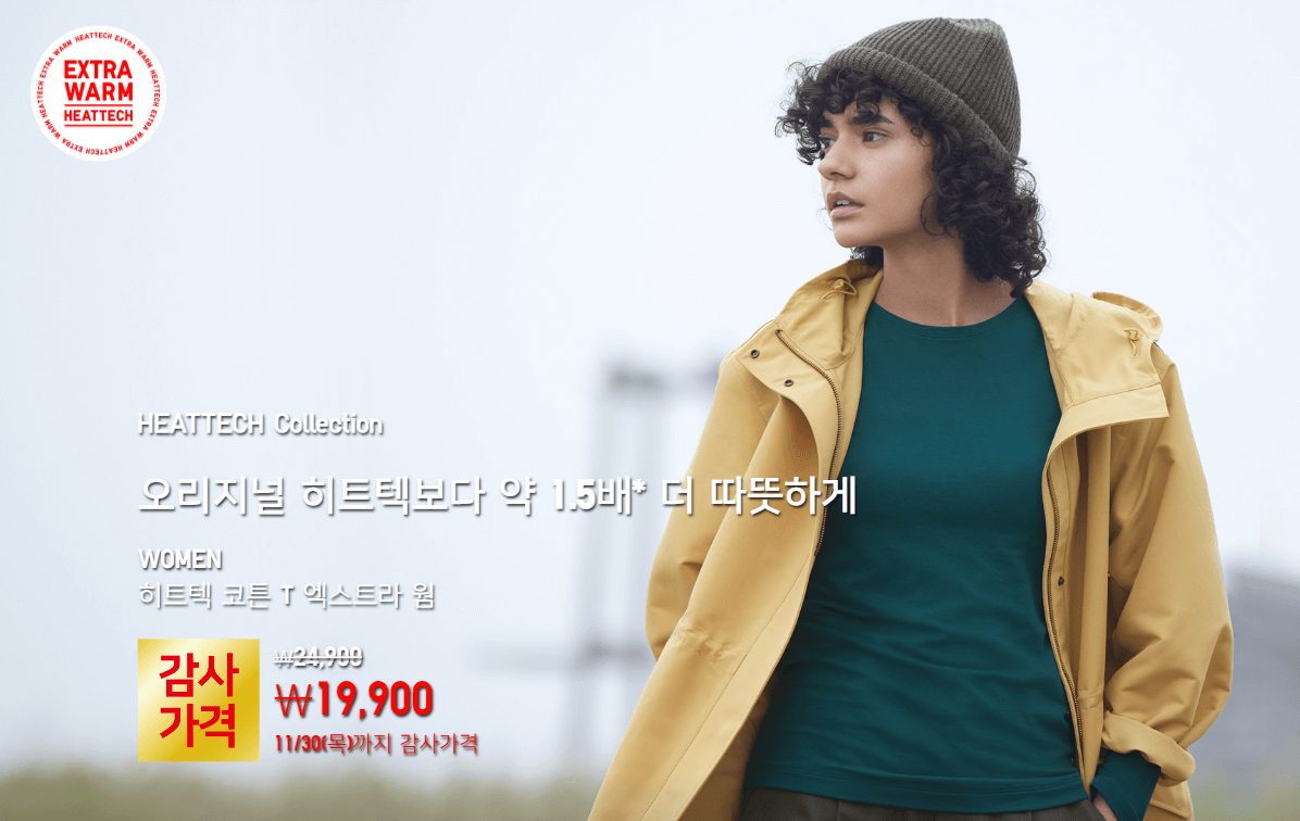 기존의 히트텍보다 1.5배 더 따뜻하고 가벼운 히트텍 코튼을 19,900원에, 플리스 집업을 29,900에 판매되고 있는데요