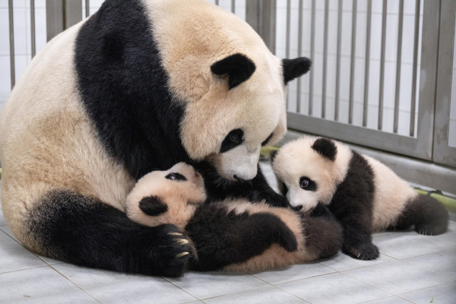 '생후 4개월' 루이바오·후이바오, 엄마 아이바오와 함께 생활 [뉴시스Pic]
